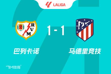 下半場(chǎng)補(bǔ)時(shí)3分鐘。最終全場(chǎng)比賽結(jié)束,巴列卡諾1-1馬競(jìng)。